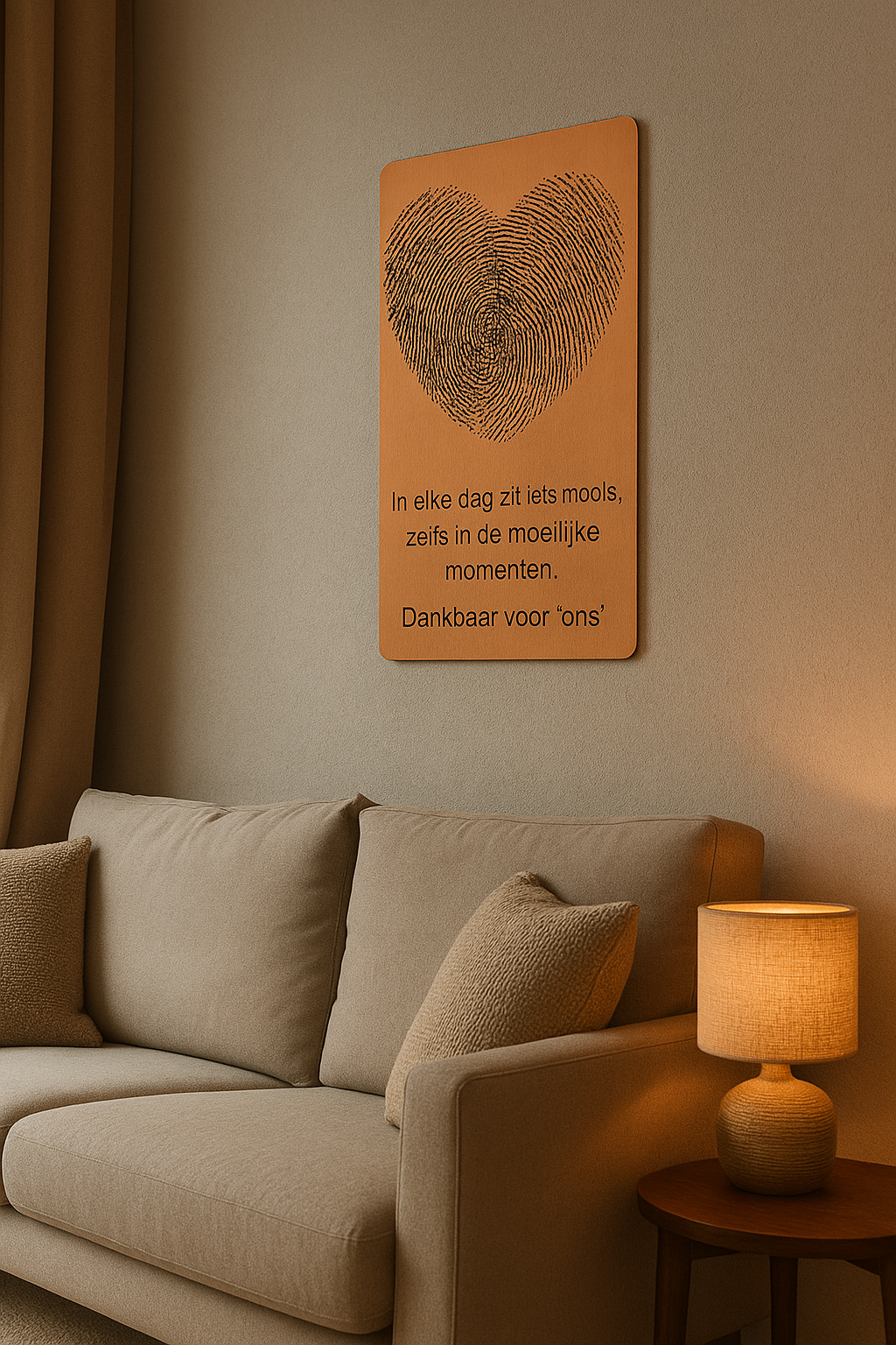 Breng warmte in je interieur met deze materialen, hier een greep uit het assortiment: koperkleurige met zwarte kern, witte met zwarte kern, of spiegel plaat waar de gravure op gemaakt wordt wanddecoratie, voorzien van twee samensmeltende vingerafdrukken in hartvorm. Een bijzonder symbool van verbondenheid.